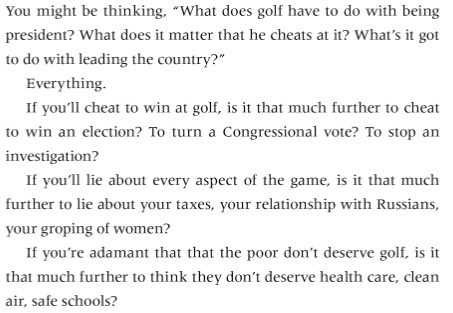 When it came time for questions, I decided to play devil’s advocate and challenge Reilly. I asked what he would say to a Trumpkin who might hear of Trump’s pathetic and childish need to cheat at golf, and might respond with “I’m still winning to vote for Trump because of tax cuts/judges/tariffs/allegedly making American great again.” Reilly responded by quoting from his book. Here is the passage he read to all of us: