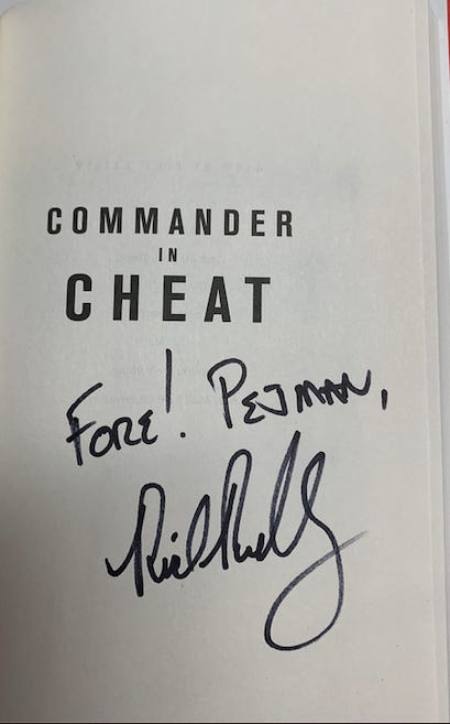 My tremendous jet-setting ways landed me at a book party this evening for Rick Reilly, the celebrated ESPN talent whose new book, Commander in Cheat: How Golf Explains Trump, has garnered significant amounts of attention and favorable reviews. I of course have not yet had time to read the book—having just purchased it this evening, at the book event—but sometimes, one actually can judge a book by its cover, and doubtless, gentle readers, you have all figured out that this book is about Trump cheating at golf and about what Trump’s predilection for cheating say about how we can judge him as a pitiful human being and as a garbage president of the United States.