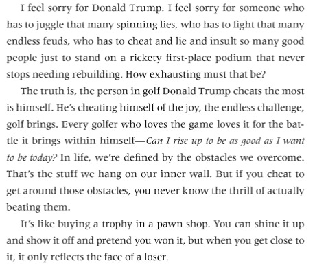 But just because I attended a party, and just because there were alcoholic drinks served, and just because much—or most—of the conversation was about Trump and golf, and just because I got Rick Reilly’s autograph and got a kick out of getting Rick Reilly’s autograph, does not mean that there are not more serious issues to consider when contemplating Trump the kinda-sorta-man and Trump the to-our-eternal-shame-president. Recall the last paragraph of the passage from Reilly’s book, featured above: “If you’re adamant that the poor don’t deserve golf, is it that much further to think they don’t deserve health care, clean air, safe schools?”
